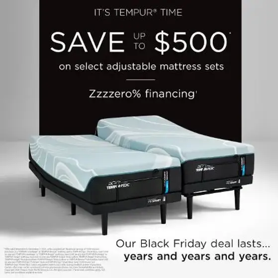 *Offer valid November 4–December 2, 2025, while supplies last. Maximum savings of $500 requires purchase of a TEMPUR-LuxeAdapt® or TEMPUR-Breeze® mattress and a TEMPUR-Ergo® Smart Base. Save $300 on any size TEMPUR-LuxeAdapt® or TEMPUR-Breeze® mattress. Save $200 on any size TEMPUR-ProAdapt® or TEMPUR-Adapt® mattress. Save $25 on any size TEMPUR-Adapt® ProLo pillow, TEMPUR-Adapt® ProHi pillow, TEMPUR-Adapt® ProAdjust pillow, TEMPUR-Breeze® ProLo pillow, or TEMPUR-Breeze® ProHi pillow. Save $200 on any size TEMPUR-Ergo® ProSmart® Base or TEMPUR-Ergo® Smart Base. Save $100 on any size TEMPUR-Ergo® Power Base. Select adjustable mattress sets only. Savings realized at time of purchase. Certain offers may not be combined. Excludes previous purchases. See store for availability and details. Copyright 2025 Tempur-Pedic North America, LLC. All rights reserved.
